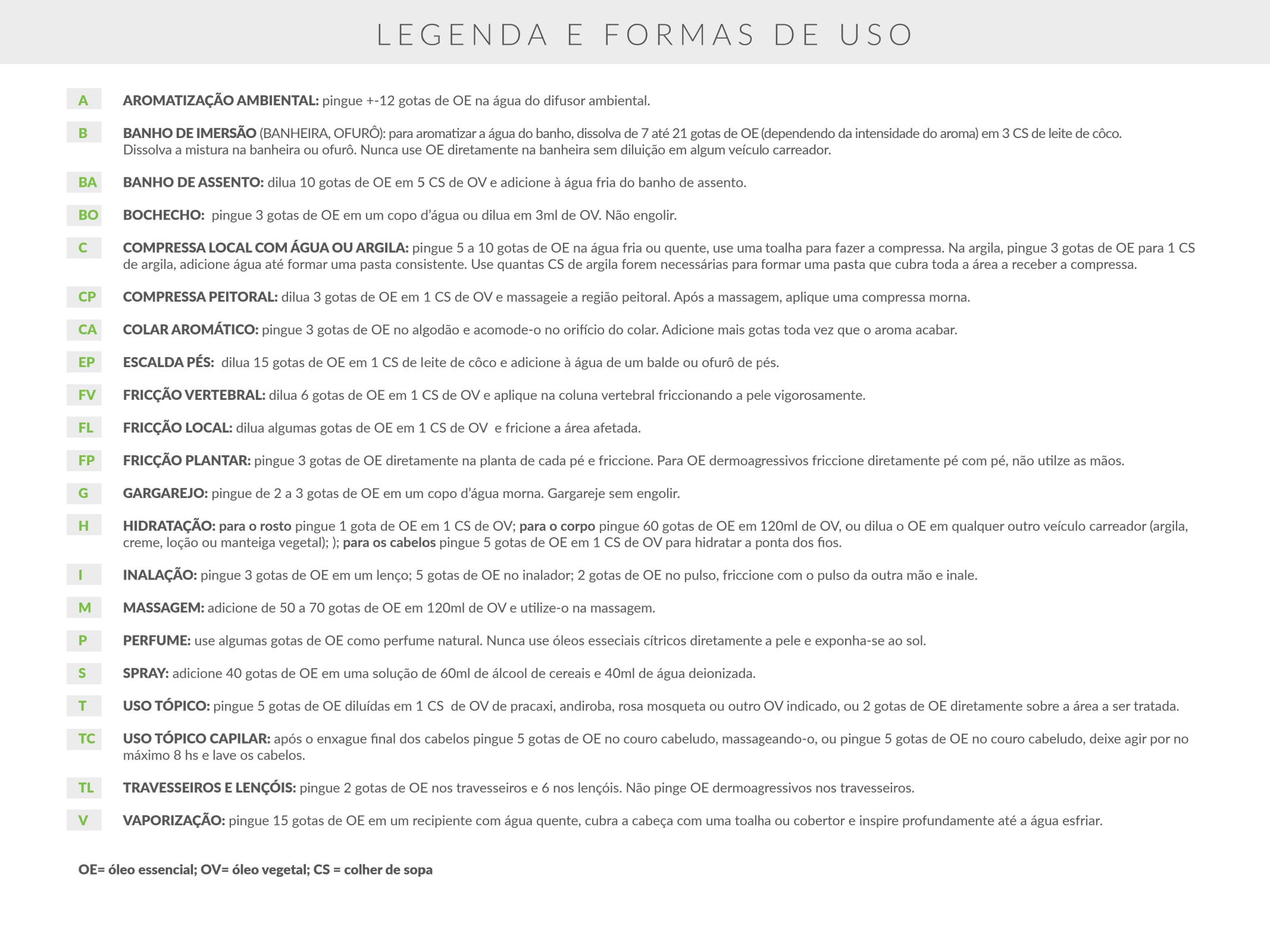 Podem ser utilizados em difusores e spray de aroma ambientais, colar aromático pessoal, rechauds, banho de imersão, compressa com água ou argila, inalação, escalda pés, vaporização, perfume natural, hidratação do rosto e corpo ou diluídos em óleos vegetais para massagens.