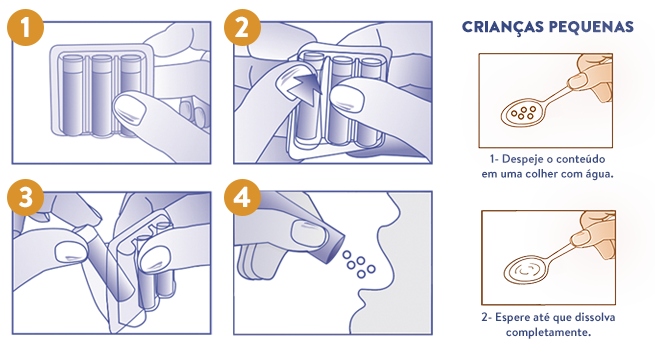 Para crianças pequenas, deixar os glóbulos dissolverem em um pouco de água numa colher de sobremesa e administrar.